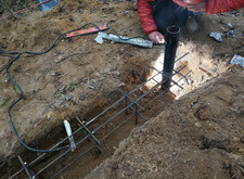 В траншею укладываем арматурную сетку, приварив её к только что вкрученным сваям.